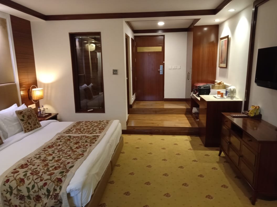 We stayed in a superior luxury room on the first floor, which came with a great view of the majestic mountains. The large bedroom featured a sofa set, a table with stationary, a wooden almirah with a wide space and a gigantic TV screen. Some cookies and fruits were waiting for us as a welcome gesture on the stylish coffee table. The king-size bed has the most beautiful headboard with an interesting pattern. The lavishly designed bathroom deserves a special mention.