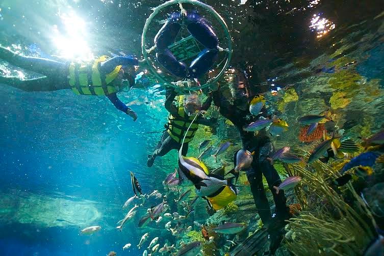 the Grand Aquarium. Guests are led by a professional diver to encounter