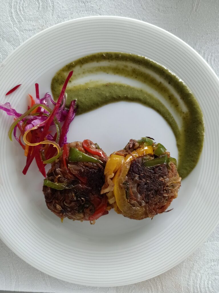 - Lunch: Meals in the afternoon were grounding and energizing. There was gram flour pancake, ragi dosai, salads for lunch. One standout dish was lentils pizza drizzled with cottage cheese & vegetables. desserts are not served ; but the last day I was served a hearty gulab jamun made with sweet potatoes. It was heavenly. I could hear the sound of birds songs replacing background chatter, while devouring their hearty meals.